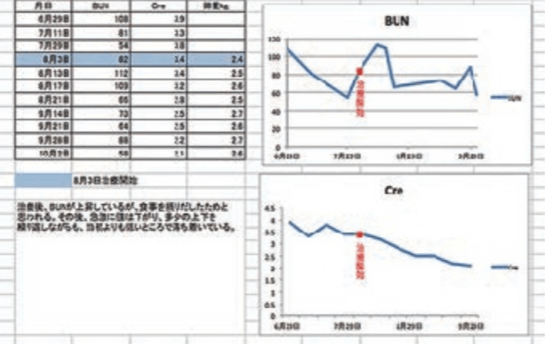 食欲旺盛で風邪などの症状もなく、BUN、Creの数値は劇的に改善し、Creは正常値と言ってよいほどです。