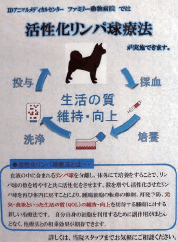 血液中のリンパ球を分離し、体外にて培養することでリンパ球の数を増やし、活性化させます。そのリンパ球を体内に戻すことで腫瘍細胞の移転・抑制、再発予防をめざし、元気・食欲といった生活の質(QOL)の維持・向上を期待する新しい治療法です。